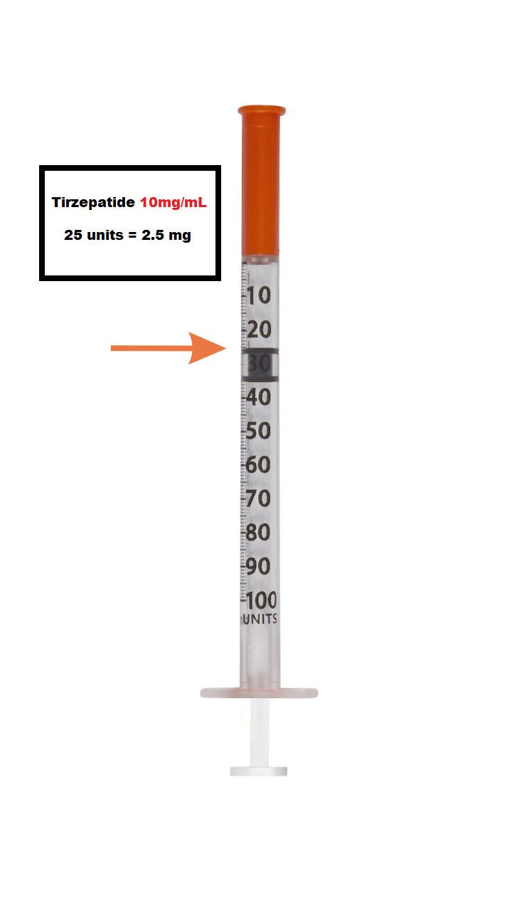 2.5mg of Tirzepatide is equal to 25 units, inject once weekly.